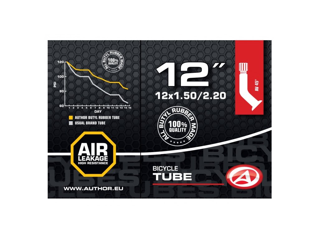 Duše AUTHOR 12x1.50-2.20 vyrobená ze 100% butylové pryže s velmi nízkou propustností pro plyny. Udrží tlak vzduchu v pneumatice jízdního kola po delší dobu, než duše vyrobené ze syn