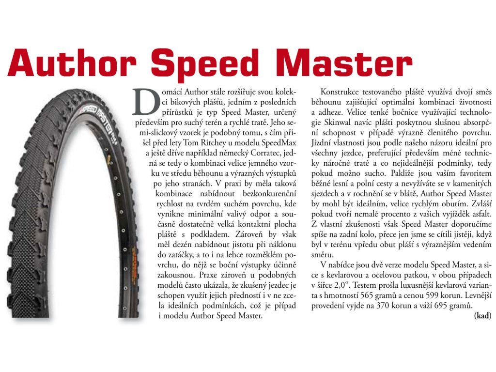 Plášť AUTHOR SPEEDMASTER je všestranný, rychlý a robustní. Středový dezén s nízkými výstupky tvaru jehlanu zaručuje nízký valivý odpor a poskytuje vynikající přilnavost na tvrdém povrchu. Hrubé boční výstupky dodají vašemu kolu stabilitu v terénu.