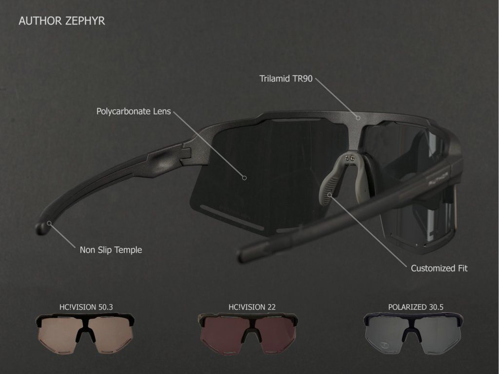 Model brýlí AUTHOR Zephyr HC!VISION 22 má speciální tvar pro dokonalou ochranu očí před slunečními paprsky a větrem. Díky flexibilnímu materiálu obrub TR90, tvaru stranic s protiskluzovými A-slip koncovkami a A-slip sedlu nosníku velmi dobře drží na obličeji. Tento model je vhodný na většinu sportovních aktivit včetně rychlostních (silniční cyklistika, lyžování, běh…). Použité čočky HC!VISION 22 výrazně zvyšují kontrast za zhoršených podmínek viditelnosti.