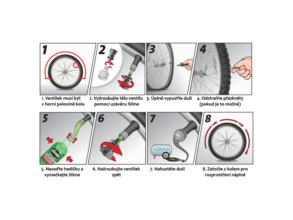 Dušové přípravky Slime je možno použít ve všech dušových kolech. Poté, co jej nainstalujete, Slime zůstává stále tekutinou s velmi vysokou viskozitou, netvrdne ani se nevysuší. Jakmile se kolo začne otáčet, rotační síla rozlije a drží gel na vnějších stěnách, tedy přesně tam, kde je třeba plášť či duši chránit proti defektu. Slime není určem jako ochrana při proražení boku pláště. Kapalina Slime určená pro dušová kola není určena pro kola bezdušová a obráceně. Dávkování na 1 duši: 120 ml/MTB, Trekking, 90 ml/Road Balení: 237ml (další možné var. balení: 473 ml, 1 gallon, 5 gallonú)