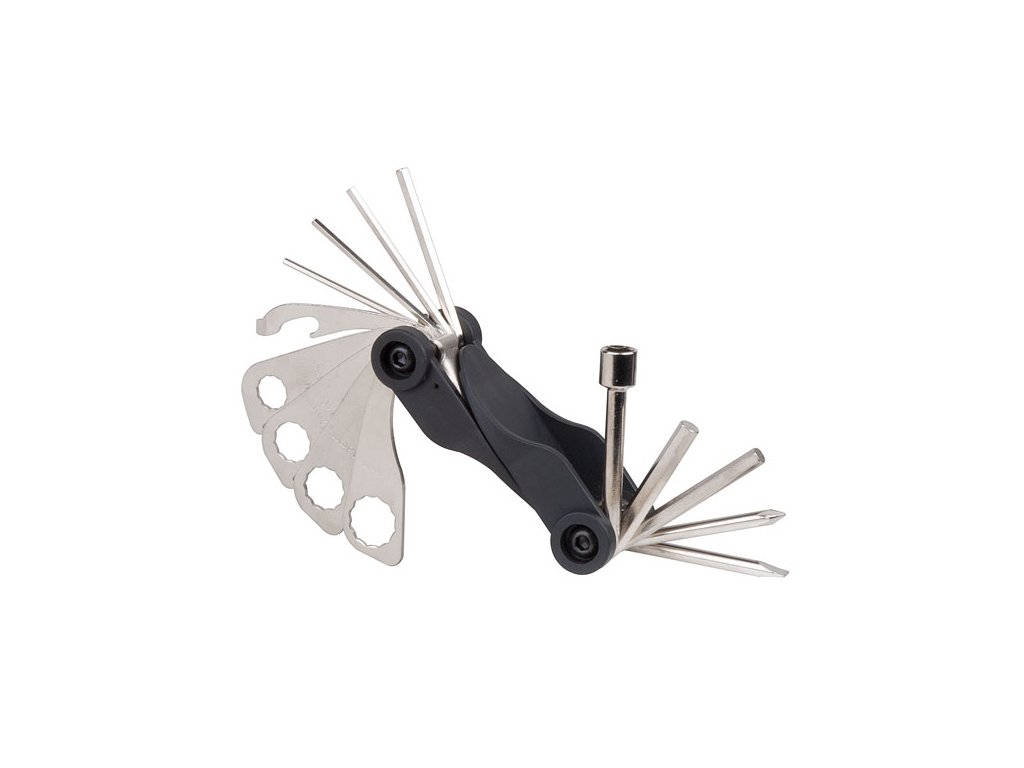 - 14-ti funkční nářadí: inbusové klíče 2/2,5/3/4/5/6 mm, prstencový klíč 8/10/12/13/15 mm, šroubovák plochý a křížový, centrklíč, otvírač lahví