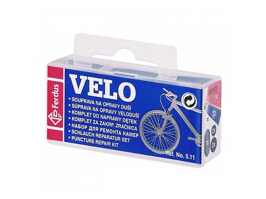 Univerzální sada pro lepení duší jízdních kol. Sada 5 záplat, lepidla (vulkanizačního roztoku) a smirkové papíru v praktické zavíratelné krabičce.