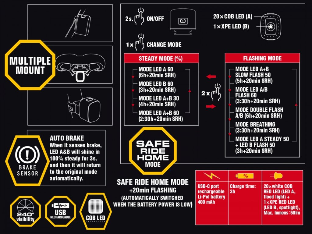 - Safe Ride Home mode – při nízké kapacitě baterie se světlo automaticky přepne do úsporného režimu, ve kterém vydrží svítit 20 minut.