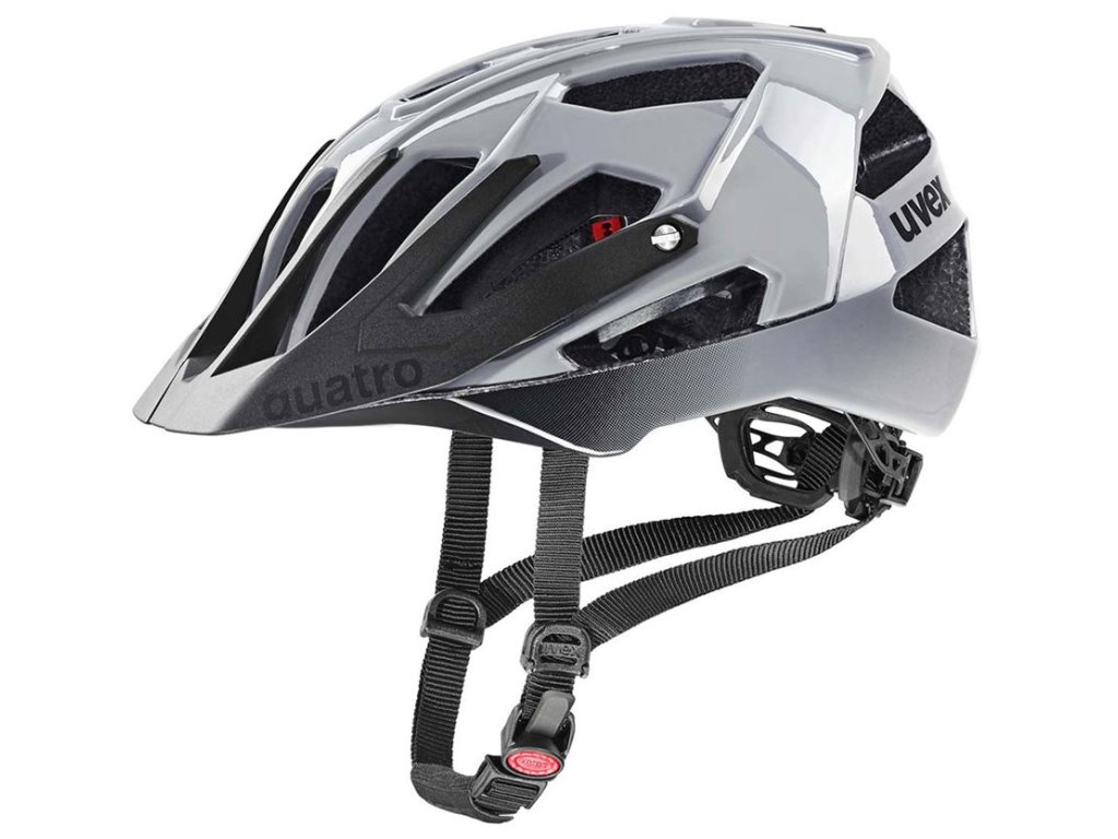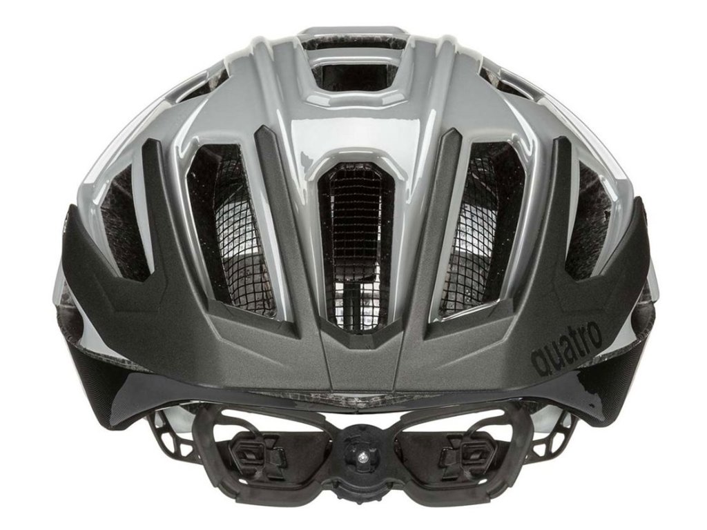 Cyklistická helma Uvex Quatro s konstrukcí skořepiny Double Inmould, která přináší ochranu i ze spodní a týlové části helmy. Jedná se o pevnou polykarbonátovou skořepinu v kombinaci s EPS pěnou, která poskytuje ochranu a pohodlí. EPS pěna se vstřikuje přímo do vnější skořepiny, tvoří tak jeden celek. Helma nabízí 17 ventilačních otvorů, čímž je zajištěna perfektní ventilace a díky zcela novému anatomickému systému IAS se dokonale přizpůsobí každému tvaru hlavy. Helma je dále vybavena komfortním systémem Monomatic - upevnění na bradě pomocí jedné ruky. Díky Fast Adapting System (FAS) lze popruhy snadno a plynule upravit přesně na míru podle tvaru Vaší tváře. Helma tak zůstane bezpečně na Vaší hlavě ve všech situacích a popruhy budou v pohodlné pozici. Tato helma dále disponuje snímatelným štítkem (lze také upravit jeho sklon pro perfektní výhled), síťkou proti hmyzu (umístěnou ve ventilačních otvorech), snímatelnými anti alergenními vycpávkami Vent pads a přípravou na LED světlo či kameru (Plug-in LED S4191150400, lze dokoupit).